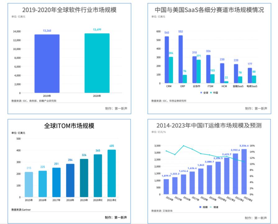 根據(jù) Gartner 和艾瑞數(shù)據(jù)顯示,2022 年全球 IT 支出預(yù)計(jì)將達(dá)到 4.5 萬(wàn)億美元,比 2021 年增長(zhǎng) 5.5%, 其中 CRM、ERP、云協(xié)作、IT 運(yùn)維等是規(guī)模最大的幾個(gè)賽道。全球 IT 運(yùn)維管理市場(chǎng)規(guī)模約為 2191.1 億美元。