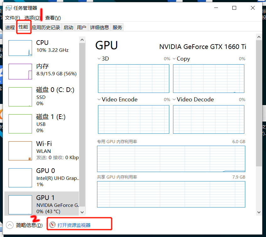 第二步:打開任務(wù)管理器以后,選擇“性能”這個(gè)菜單,點(diǎn)擊“打開資源監(jiān)視器”。