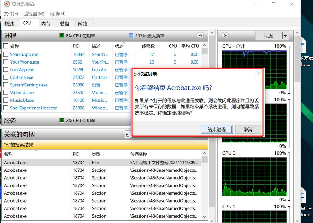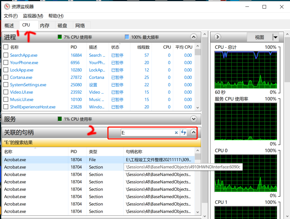 第四步:之前打開的資源監(jiān)視器,菜單欄選擇“CPU”,在關(guān)聯(lián)的句柄里面輸入之前在“此電腦”查看到的盤符E: ,請(qǐng)注意一定是英文狀態(tài)下的冒號(hào),千萬別寫成中文狀態(tài)下的了。點(diǎn)擊搜索框,然后找到句柄名稱帶E: 的,右鍵該句柄名稱,結(jié)束進(jìn)程。