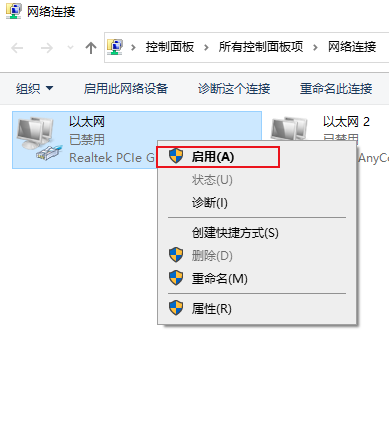 3、選擇【本地連接>啟用】即可恢復(fù)