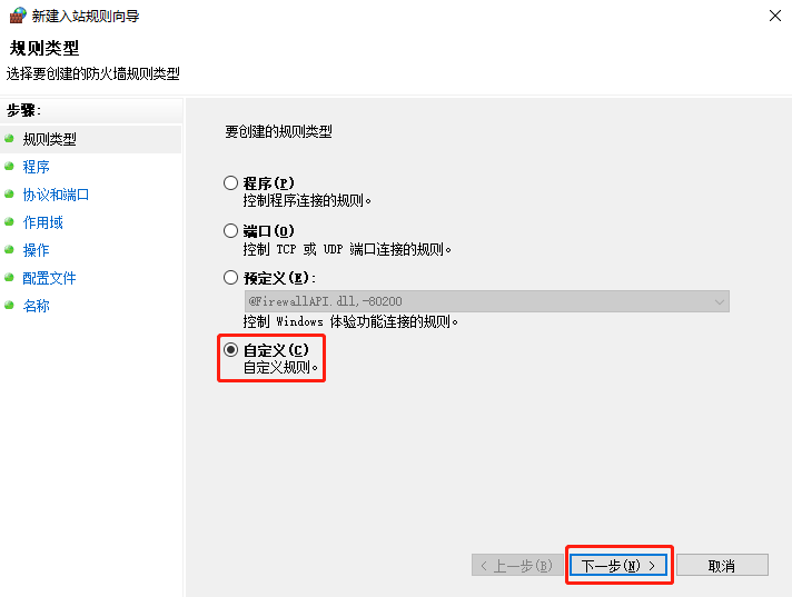 3.然后,在“新建入站規(guī)則向導”窗口里的“規(guī)則類型”中選擇“自定義”并點擊“下一步”
