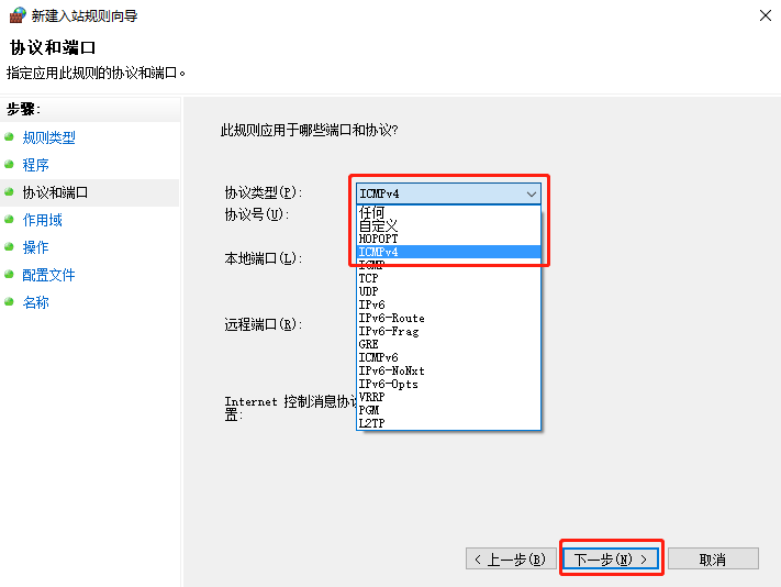 5.在“協(xié)議和端口”中,選擇“ICMPv4”協(xié)議類型并點擊“下一步”