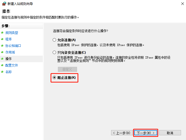 7.在“操作”中,選擇“阻止連接”點擊“下一步”
